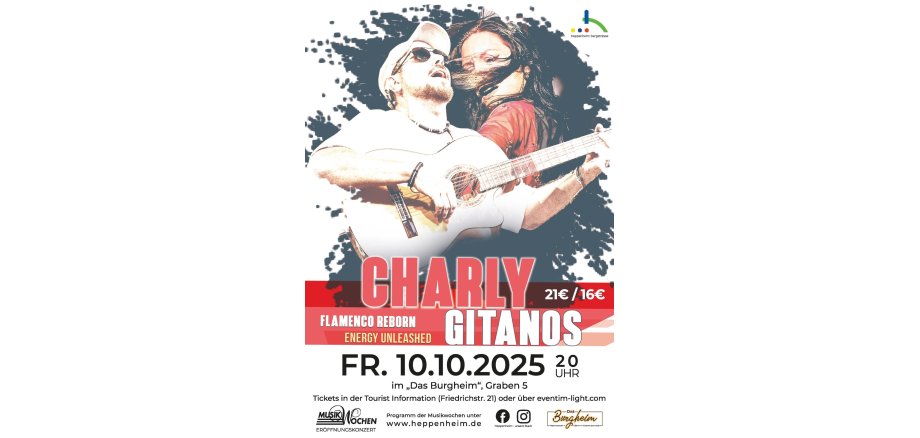 Unter dem Titel „Flamenco Reborn – Energy Unleashed“ steht das diesjährige Eröffnungskonzert der Musikwochen der Kreisstadt Heppenheim am Freitag, den 10.10.2025 im „Das Burgheim“. Das international bekannte Charly Gitanos Quartett entführt die Gäste mit seiner mitreißenden Performance aus Musik und Tanz einen Abend lang nach Spanien. Flamenco und Popelemente werden dabei im Stil der legendären Gipsy Kings miteinander verknüpft. Mit dabei sind Charly Gitanos (Gesang, Gitarre und Percussion), Ano Shaglia (Tänzerin und Sängerin), David Bermudez (Piano, Percussion und Chorgesang) sowie Karen Clark (Tänzerin und Percussionistin).