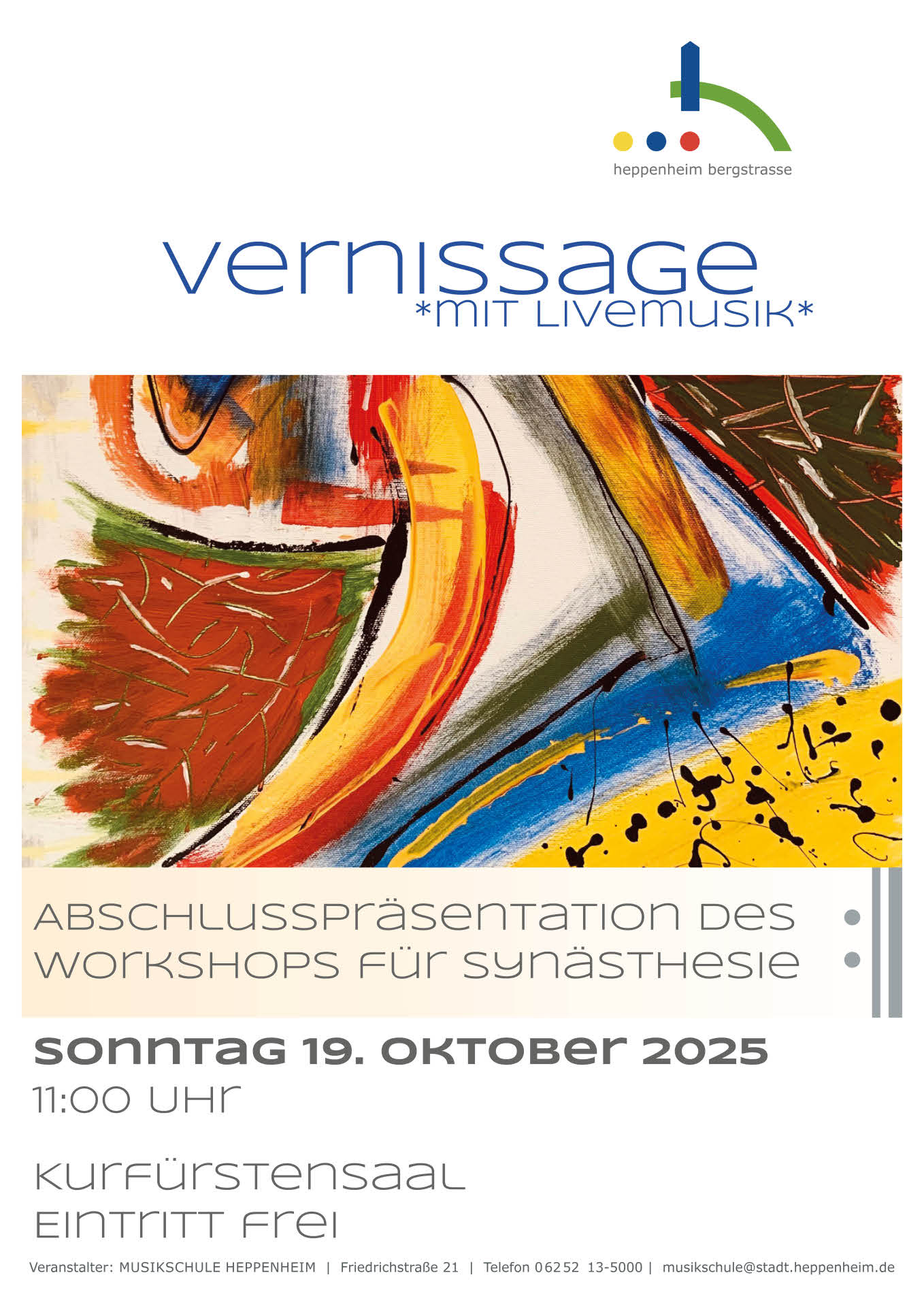 In den Herbstferien veranstaltet die Musikschule Heppenheim einen Workshop zum Thema Synästhesie von Musik und Kunst. Geleitet wird der Workshop von Silke Schulder (Musikschullehrerin) und Ulrike Fried-Heufel (freischaffende Künstlerin). Musikalische Parameter wie Dur und Moll, schnell und langsam, legato und staccato, sollen unter Anleitung der Dozentinnen mittels verschiedener Maltechniken auf Leinwand gebracht werden. Der Eintritt ist frei.