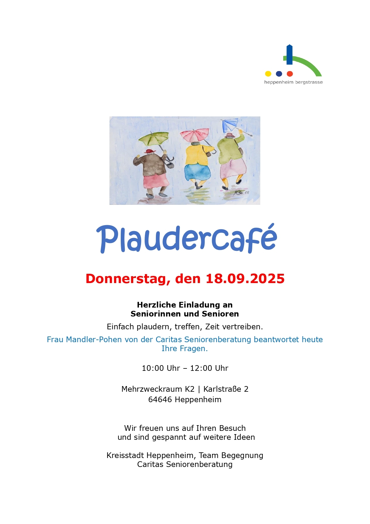 Das nächste Plaudercafé findet am Donnerstag, den 18.09.2025 in der Zeit von 10:00 Uhr bis 12:00 Uhr statt. Eine Einladung an ältere Mitbürgerinnen und Mitbürger aus Heppenheim um einfach zu plaudern, sich zu treffen, gemeinsame Zeit zu verbringen.