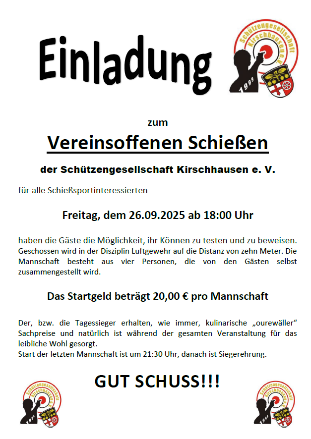 Für alle Schießsportinteressierten Freitag, dem 26.09.2025 ab 18:00 Uhr
