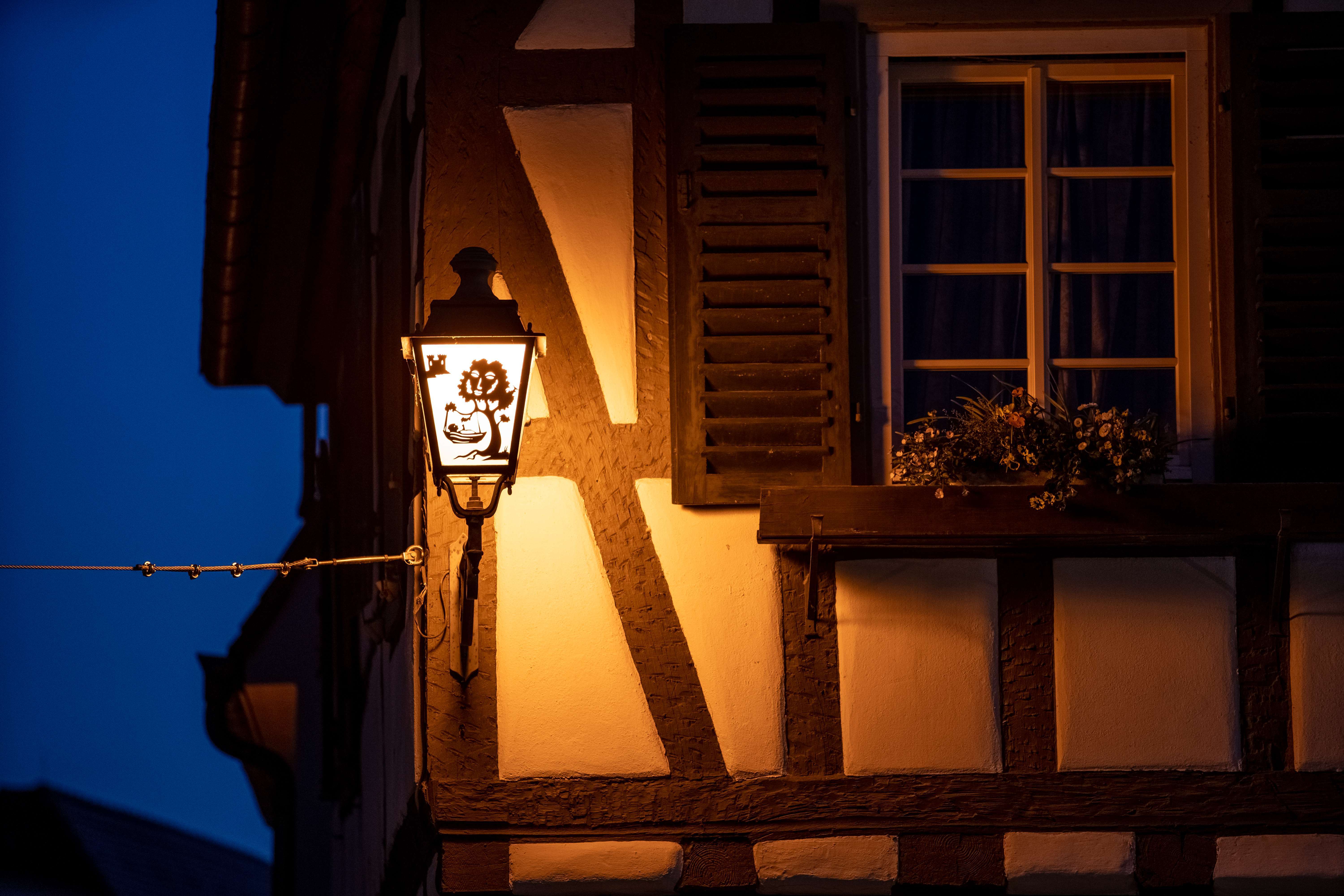 Die Straßenlaternen in der Heppenheimer Altstadt sind mit kunstvoll gestalteten Scherenschnitten versehen. Gewandete Führer begleiten Sie entlang des Abends beleuchteten Laternenwegs und erzählen aus der hessischen Sagenwelt.