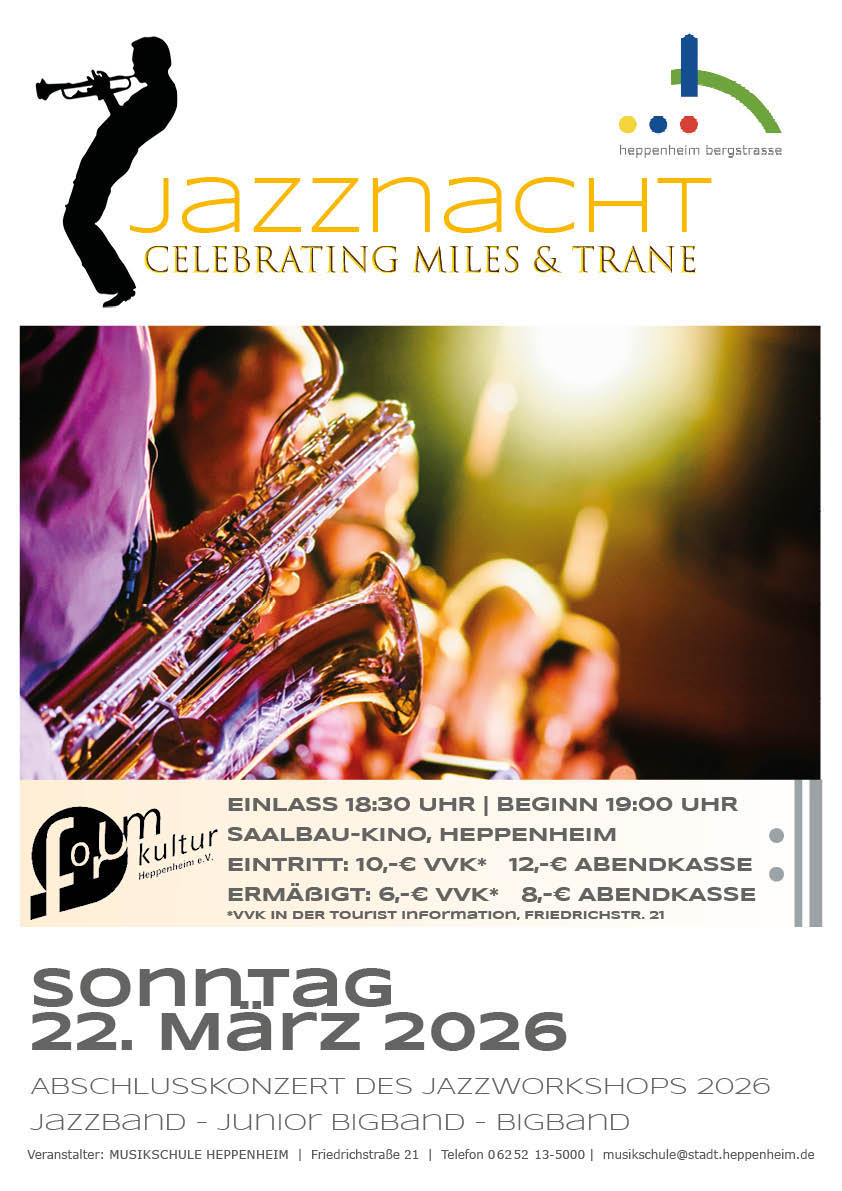 Jazz made in Heppenheim – am 22.03.2026 bringt die Musikschule der Kreisstadt den Bergsträßer Jazznachwuchs auf die Bühne und setzt mit der 17. Heppenheimer Jazznacht eine mittlerweile langjährige Tradition fort. Nach einem zweitägigen Workshop geben Bigband, Junior-Bigband und Jazzband der Musikschule unter der Leitung von Thomas Markowic, Christian Seeger und Christian Eckert eine ausgiebige Kostprobe ihres Könnens. Das diesjährige Programm steht unter dem Motto „Celebrating Miles & Trane“ und begibt sich auf die Spuren der Jazz-Legenden Miles Davis und John Coltrane, die beide in diesem Jahr 100 Jahre alt geworden wären.