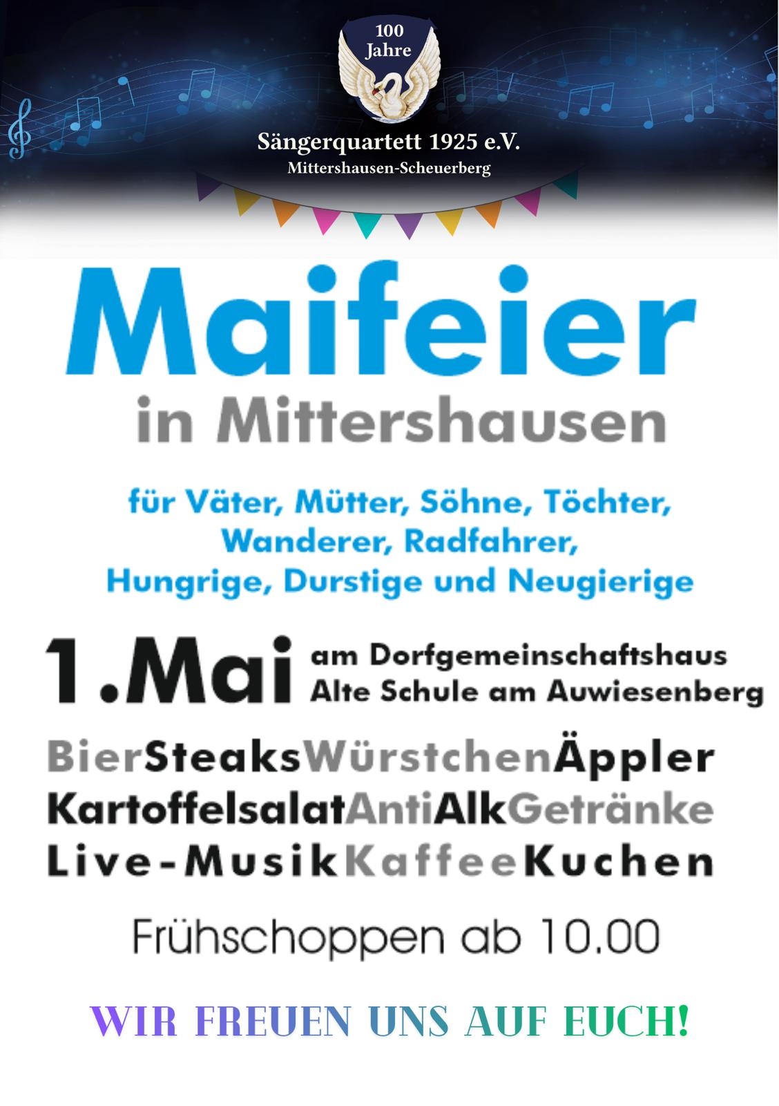 Das Sängerquartett 1925 e.V. Mittershausen-Scheuerberg veranstaltet am 1. Mai sein traditionelles Grillfest beim Dorfgemeinschaftshaus am Auwiesenberg. Hierzu sind alle Mitglieder, Freunde und Gönner, die Ortsbevölkerung und besonders die auswärtigen Gäste herzlich eingeladen.
