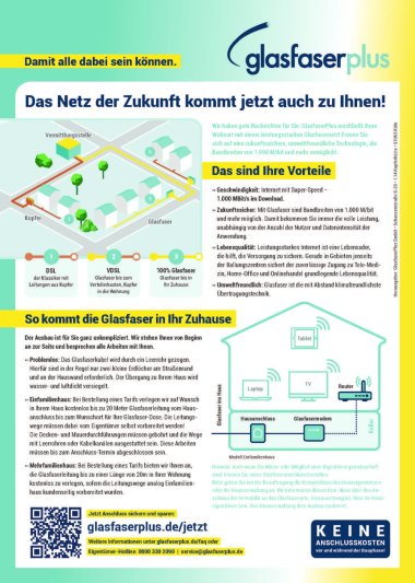 Während der Ausbauphase kann eine Immobilie kostenfrei an das Glasfasernetz angeschlossen werden, wenn ein Glasfaser-Tarif bei einem Telekommunikationsanbieter gebucht wird. Dafür ist lediglich eine Genehmigung zur Herstellung des Anschlusses auf Privatgrund erforderlich.
